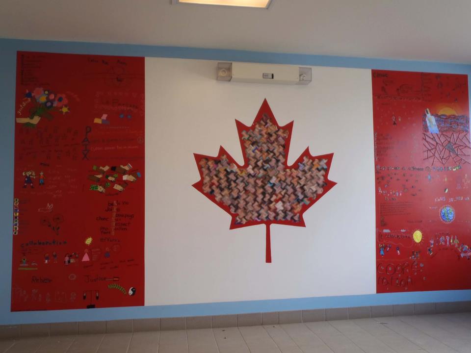 Voici des photos de près de la murale qui se trouve dans les escaliers de l’École des Bâtisseurs à Fredericton N.-B. troisième plancher. Chaque classe a dessiné une image qui est représentée dans les bandes rouges du drapeau. Des élèves de chaque classe sont venus peindre dans le rectangle de leur classe.