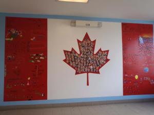 Here are some close up photos of this mural which can be found at Ecole des Batisseurs in Fredericton NB, in the stair well, 3rd floor. Each classe drew and image to fit in a rectangle in the red parts of the flag. Students from each classe came to draw in their rectangle.