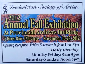FSA Nov 2012 Fredericton Society of Artists group show November 2012 At Archival Building at the UNB Campus here is the map to get there: Here are the paintings have at this show: ”Fireworks” 10×8 ”Oranges” 10×8 ”The Wave Chaser” 12×12 Share this: Click to share on Facebook (Opens in new window) Facebook Click to share on X (Opens in new window) X Like Loading... Related
