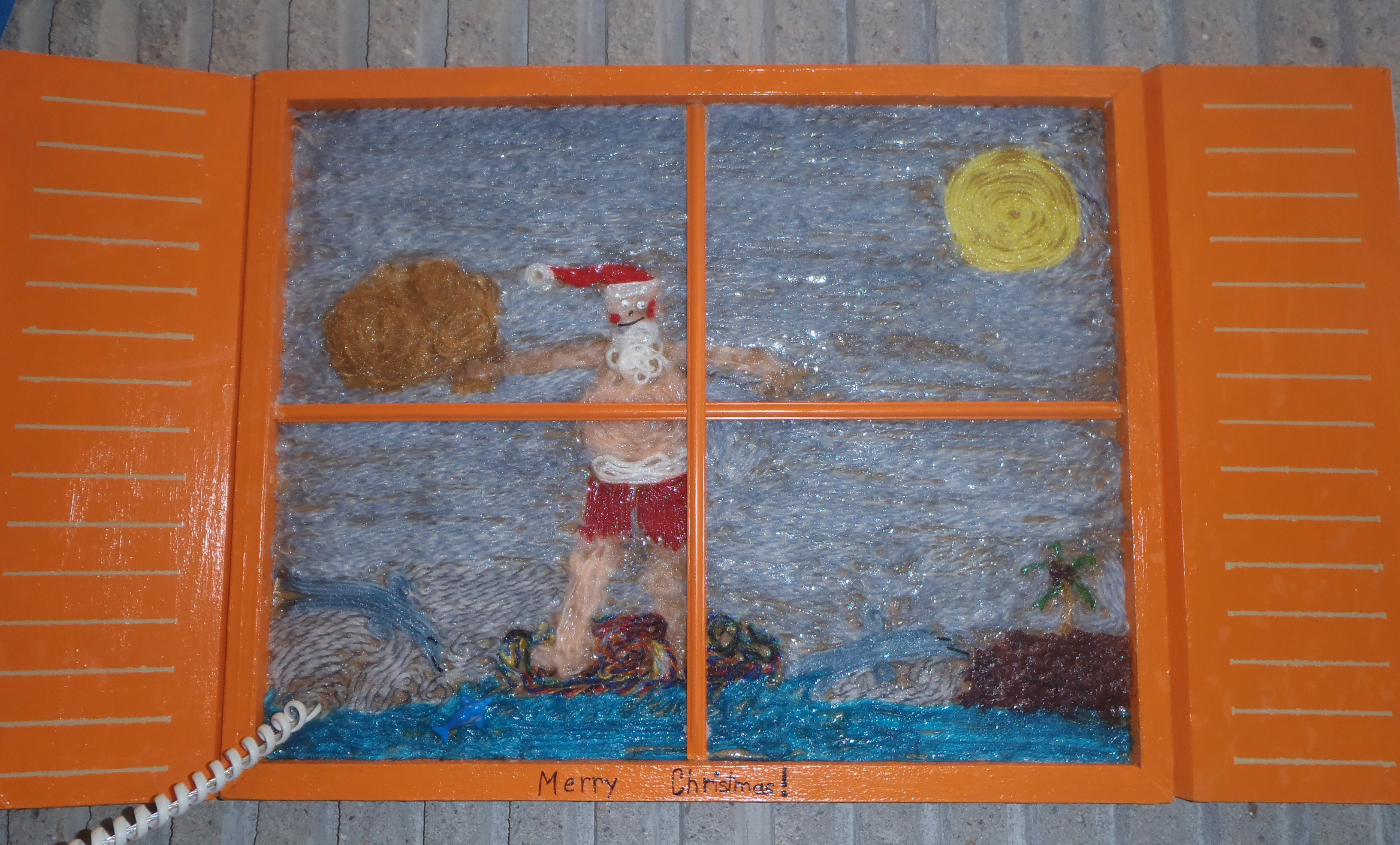 The Australia, Santa arrives in a helicopter, a train or even by kangaroo back. On Christmas eve surfs up to deposit gifts in children’s tongs. On Christmas day, December 25th, australiens practice two traditions: The do a pique nique on the beach and a surf contest while dressed as santa. This window was done with pieces of yarn. It is a scene of santa surfing while distributing gifts.