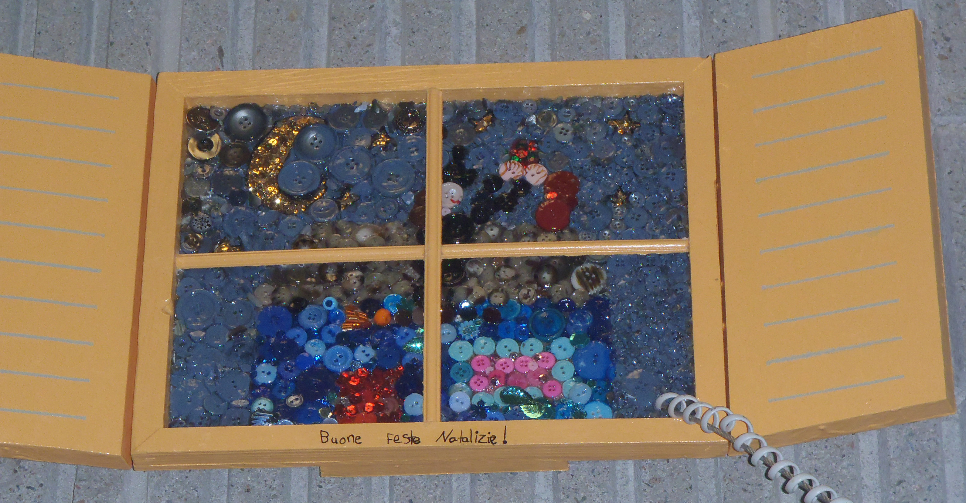 In the Italie window, we see the legend of the Befena witch. She passes in the night of January 5th and 6th to give gifts to all the ”Bambinis” who were good. This image is made of buttons, it shows the witch putting a gifts in the chimney.