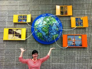 Smart Art project, Décember 2011. For this project I collaborated with the grade three teachers. Together with the students we produced this work of art to show how five different countries celebrate Christmas in their part of the world. Each window represents a different country. The images in the windows and the globe were done in mosaic using various recycled materials.