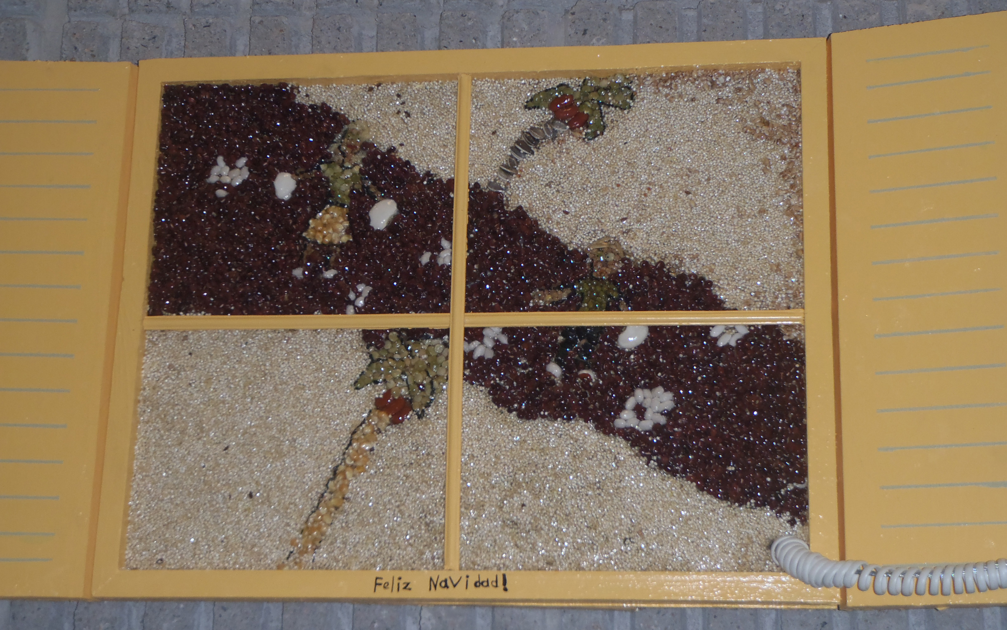 Au Mexique, les enfants font du porte-à-porte pour recevoir des beignets spéciaux qu’on appelle Buñuelos. Chaque fois qu’un beignet est mangé, les enfants cassent une assiette dans la rue puisque cela porte chance. Cette fenêtre a été fabriquée avec différentes sortes de graines et de haricots secs, que nous avons collés sur une couche de colle. L’image représente un garçon et une fille en train de casser des assiettes dans la rue.