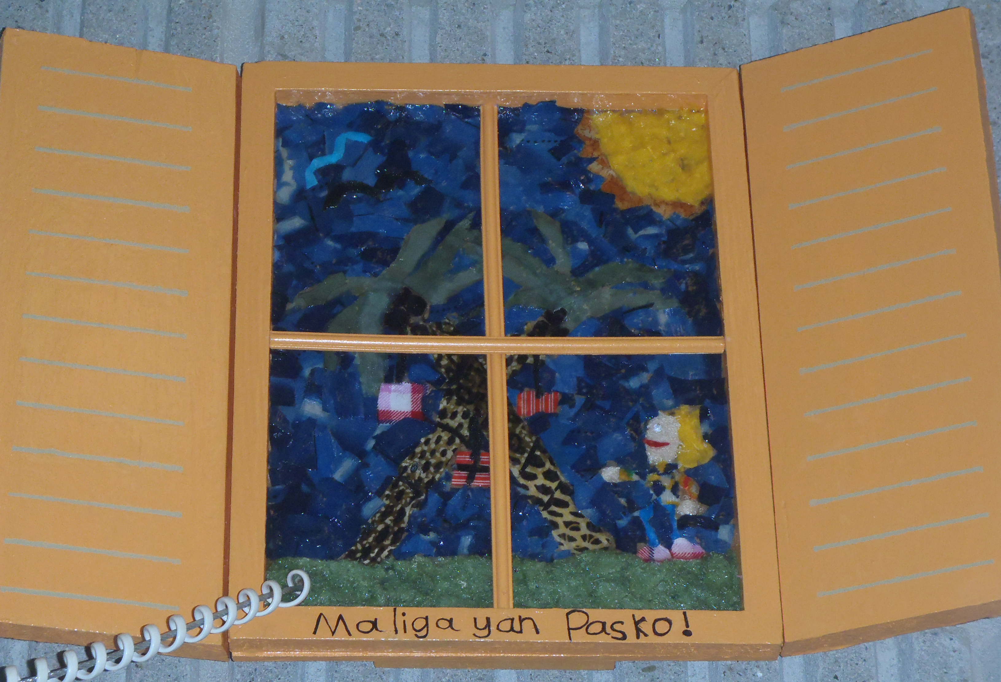 In the Philippines, the Christmas tradition is different than ours. In fact the god parents are the ones who hang gifts on palm trees instead of under pine trees. The children then try to untie these gifts. The materials used to make this window were tissu pieces of various colours cut up and glued into this scene.