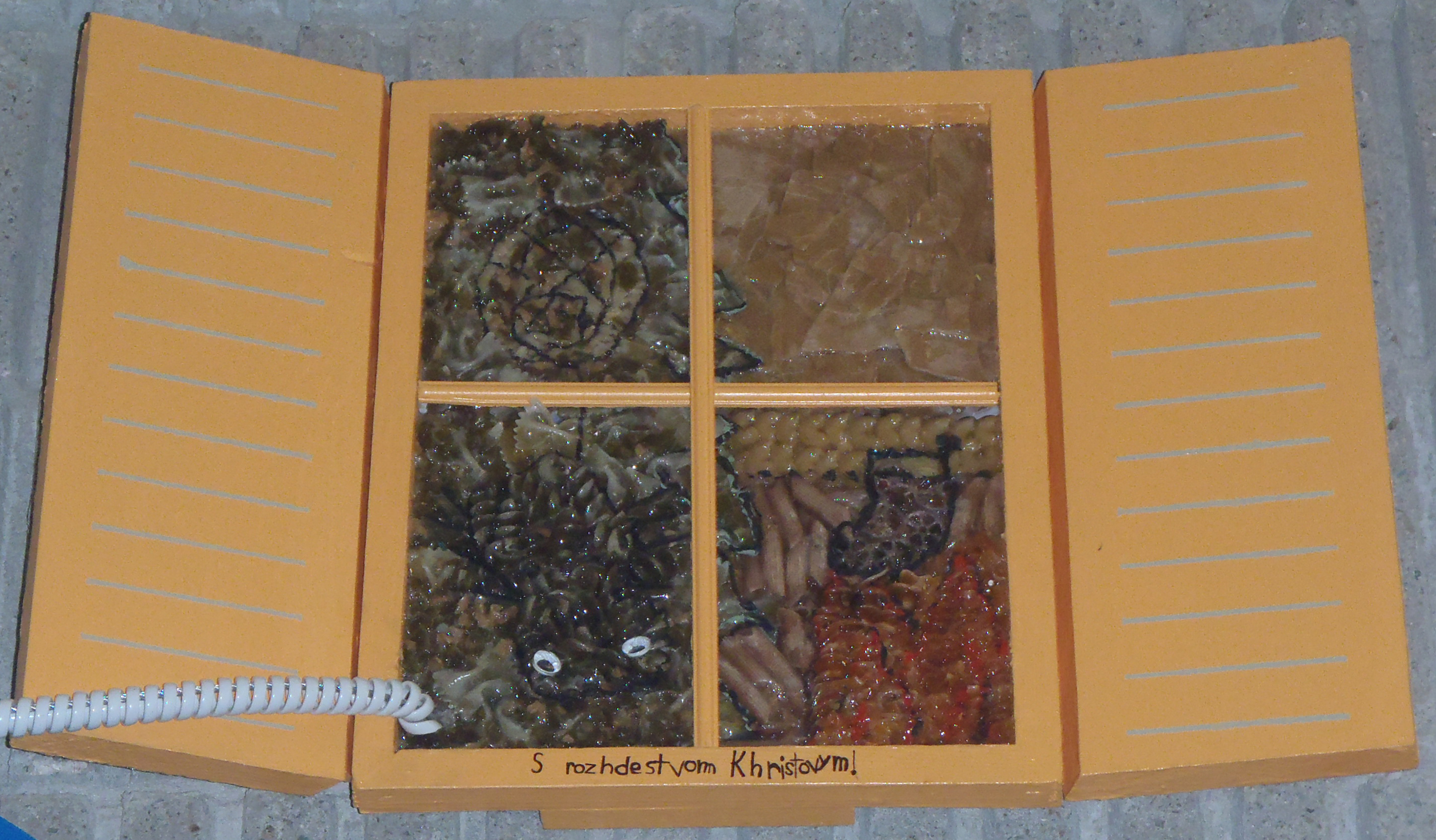In Russia, the legend says that a long time ago a very poor family had nothing with which to decorate their tree. Kids were crying because and this touched the hearts of spiders. These spiders spun webs all around the tree. When the sun shines on these wonderful webs it reflects a gold colour. Until this day people in Russia place a spider on their tree for good luck. This window shows a spider in the tree with noodles.
