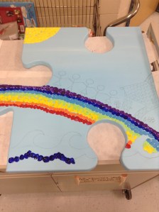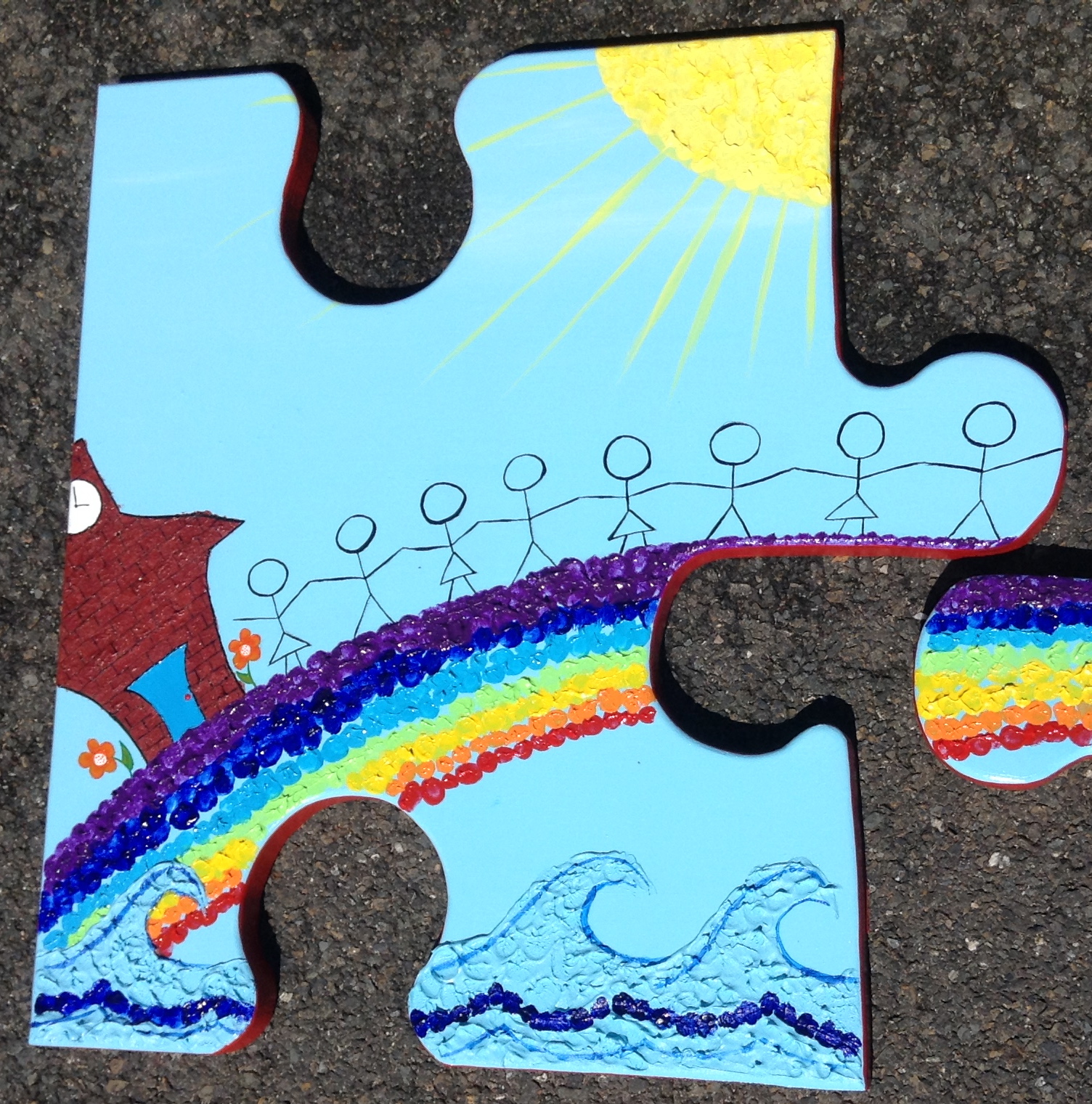 These two puzzle pieces have been painted on by the children who are at École des Bâtisseurs this May 2015. It was a project to help the children make the transition with the new school in the fall. It is wonderful to have this new school which means more room for all, but friends will be separated. Through this project, the children get to place their thumb print on the piece that will go to the other school. Therefore leaving a piece of them with their friends. Here are the results;