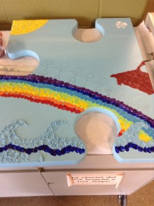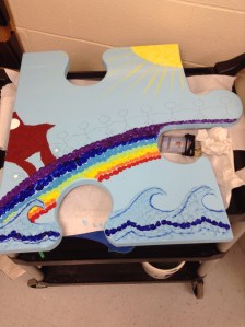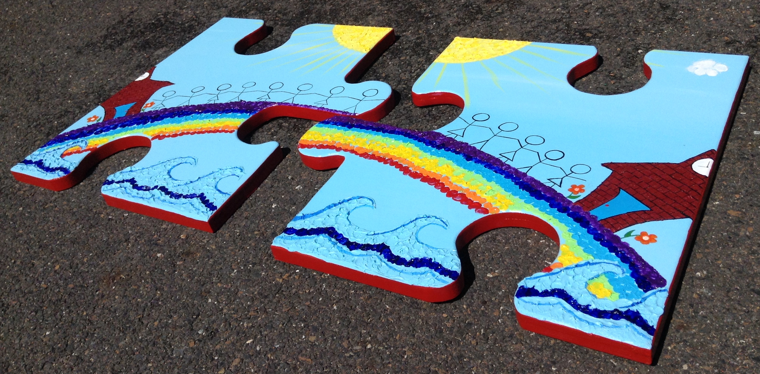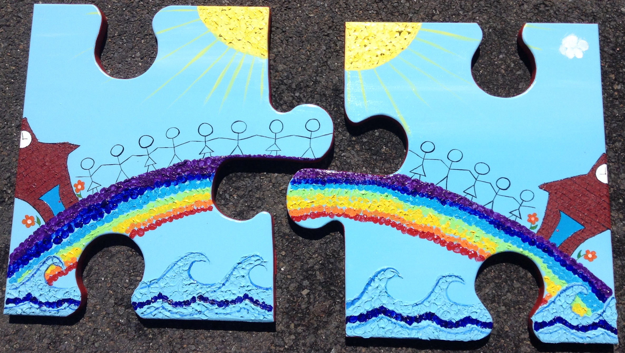 Ces deux morceaux de casse tête sont les pièces sur lesquels les jeunes de l’École des Bâtisseurs on peint en mai 2015 pour aider leur transition avec la nouvelle école. Tout le monde sont bien content d’avoir une nouvelle école qui donnera plus de place à tout, mais les ami(e)s vont être séparé. Ce projet à permis au jeunes de placer leur emprunt ou un coup de pinceaux, sur une des pièces qui sera dans l’école de leurs ami(e)s. Voici les résultats;