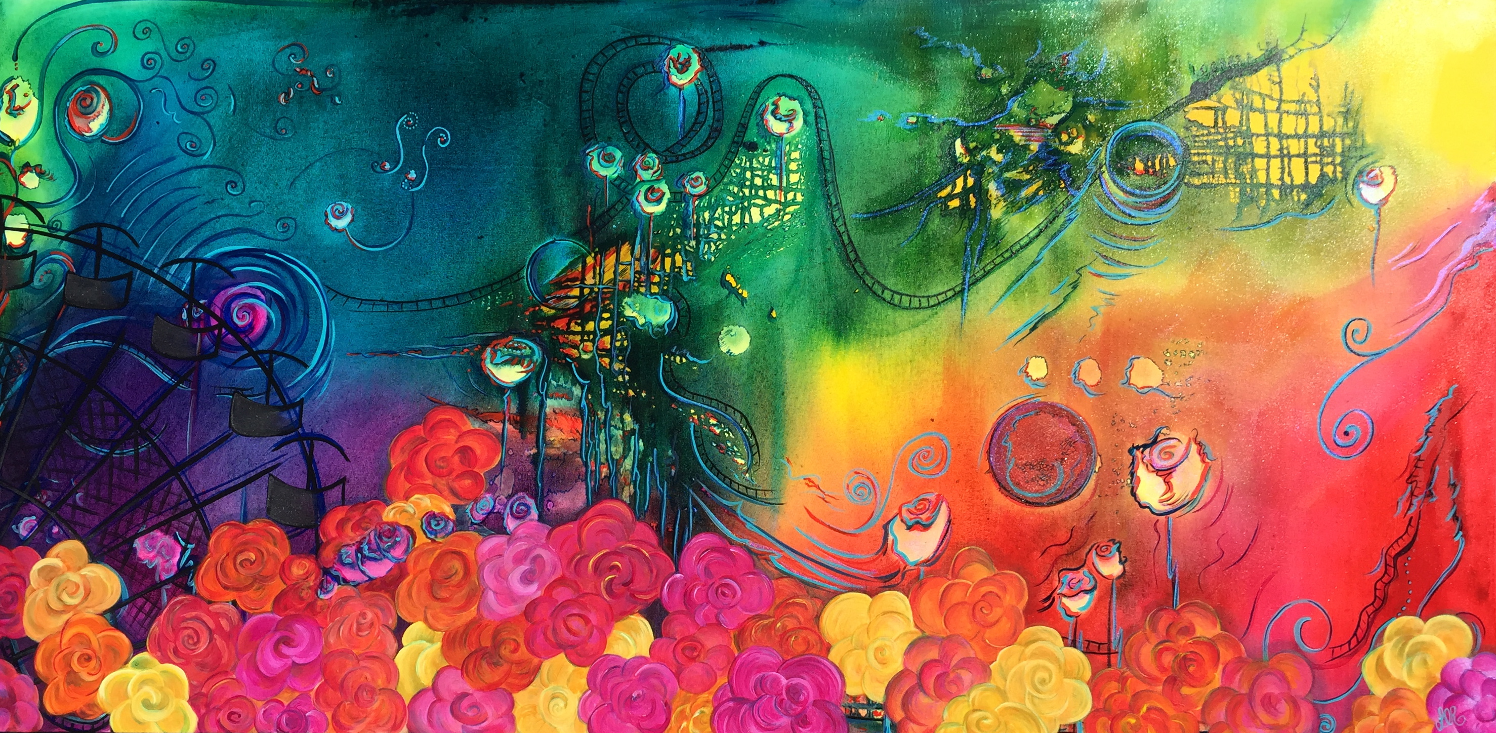 Fun Run I did to music. This was inspired completely by one song…’Love Runs Out’ by One Republic. I just listened to that song when painting this one. So this is how I see that song as a painting! If you look closely you’ll see a roller coaster and a ferris wheel. SOLD