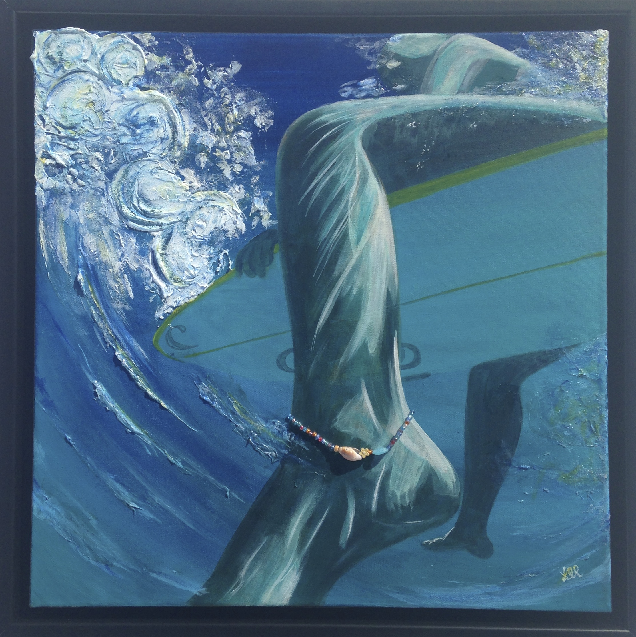 Dreamin’ is one of my beach paintings. This image is so relaxing to me. It’s relaxing to look at this surfer from underwater and the idea that the surfer is just sitting, bopping around with the little waves while waiting for the wave to surf is also a relaxing moment. She is wearing an anklet that I beaded with a real seashell.