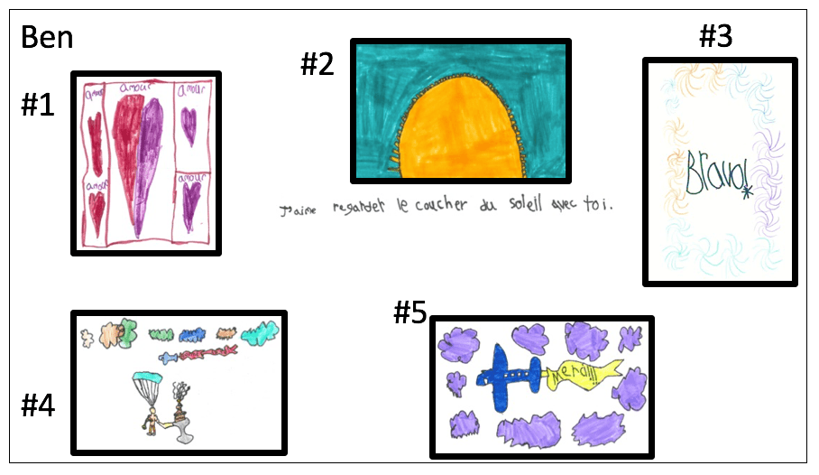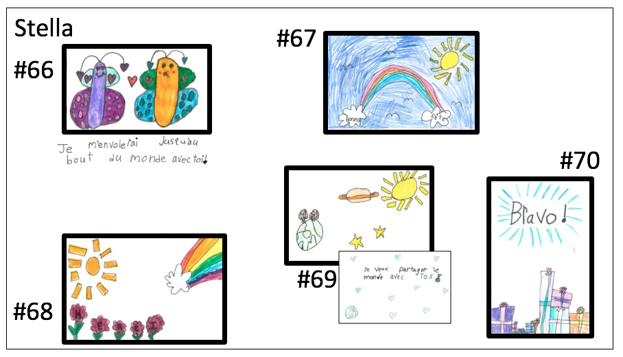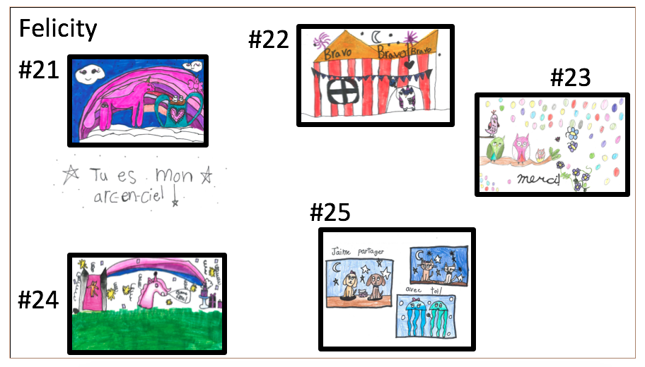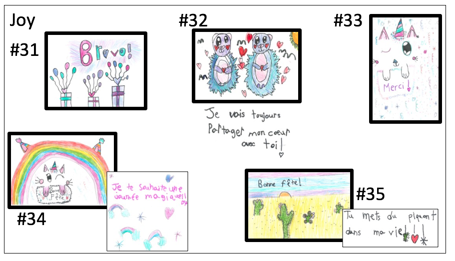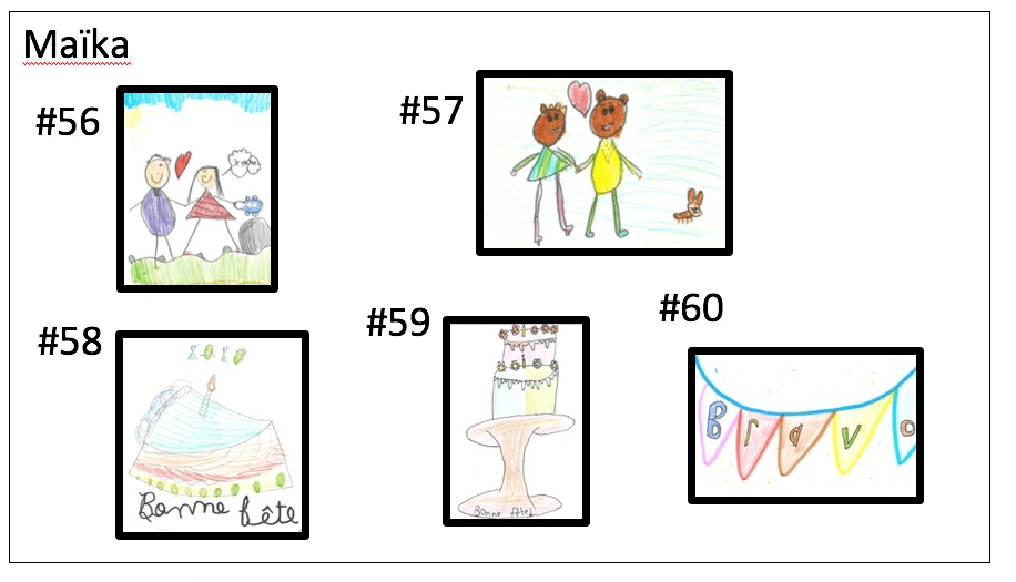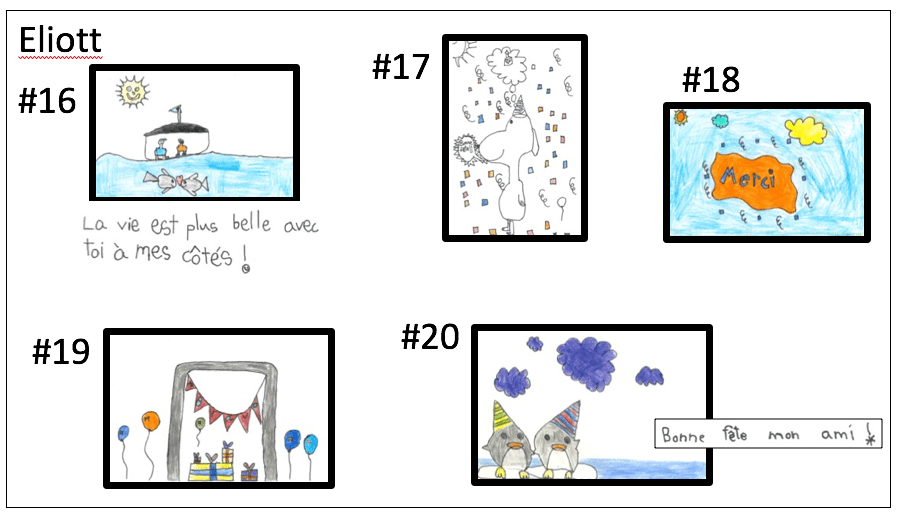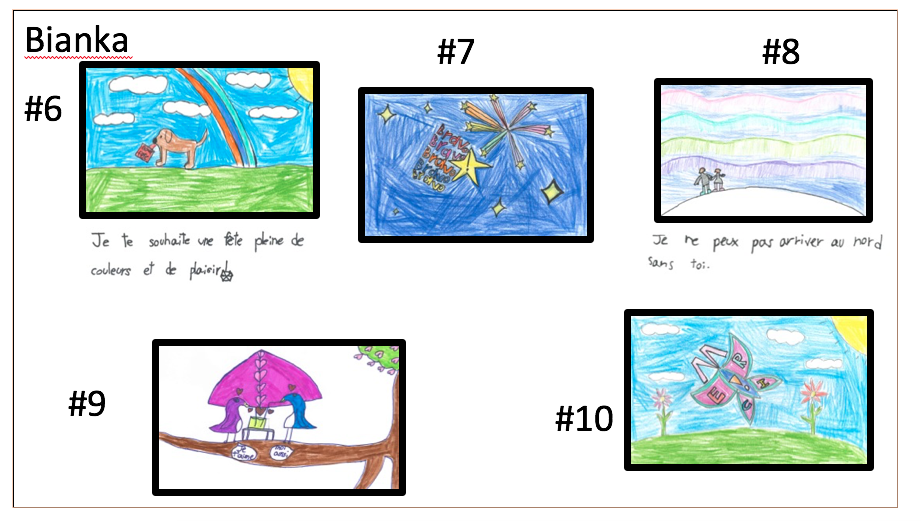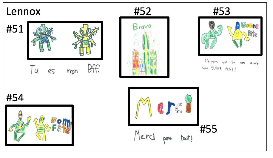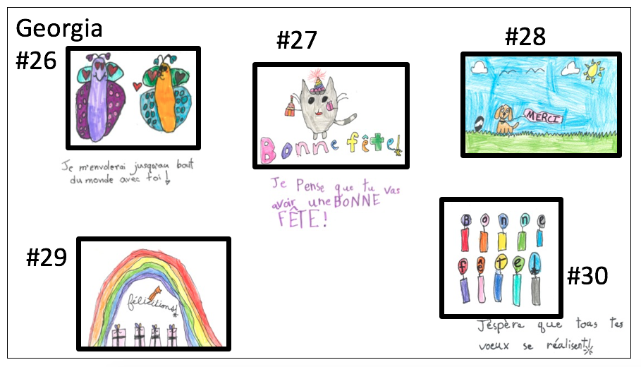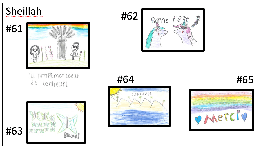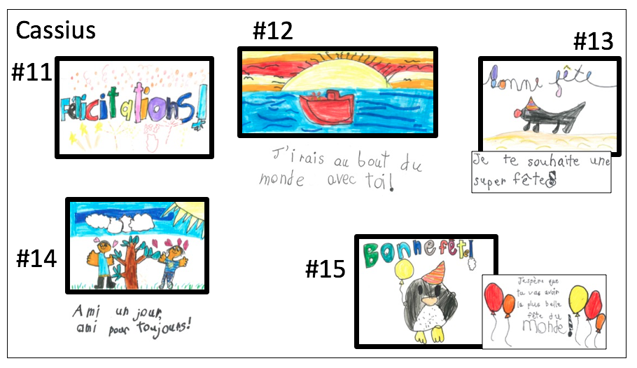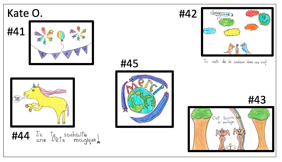 Mme Angèle and I discussed certain themes with the students before starting sketches and then finalizing their images for the cards. They worked on themes such as: Friendship, Birthday, Congratulation, and Thank you. I helped the students learn to draw their chosen images and then I took those images and prepared these on what will be the printed cards. In the back of the card the student signed their names and I added the school logo and name of the project. For a professional completed look.