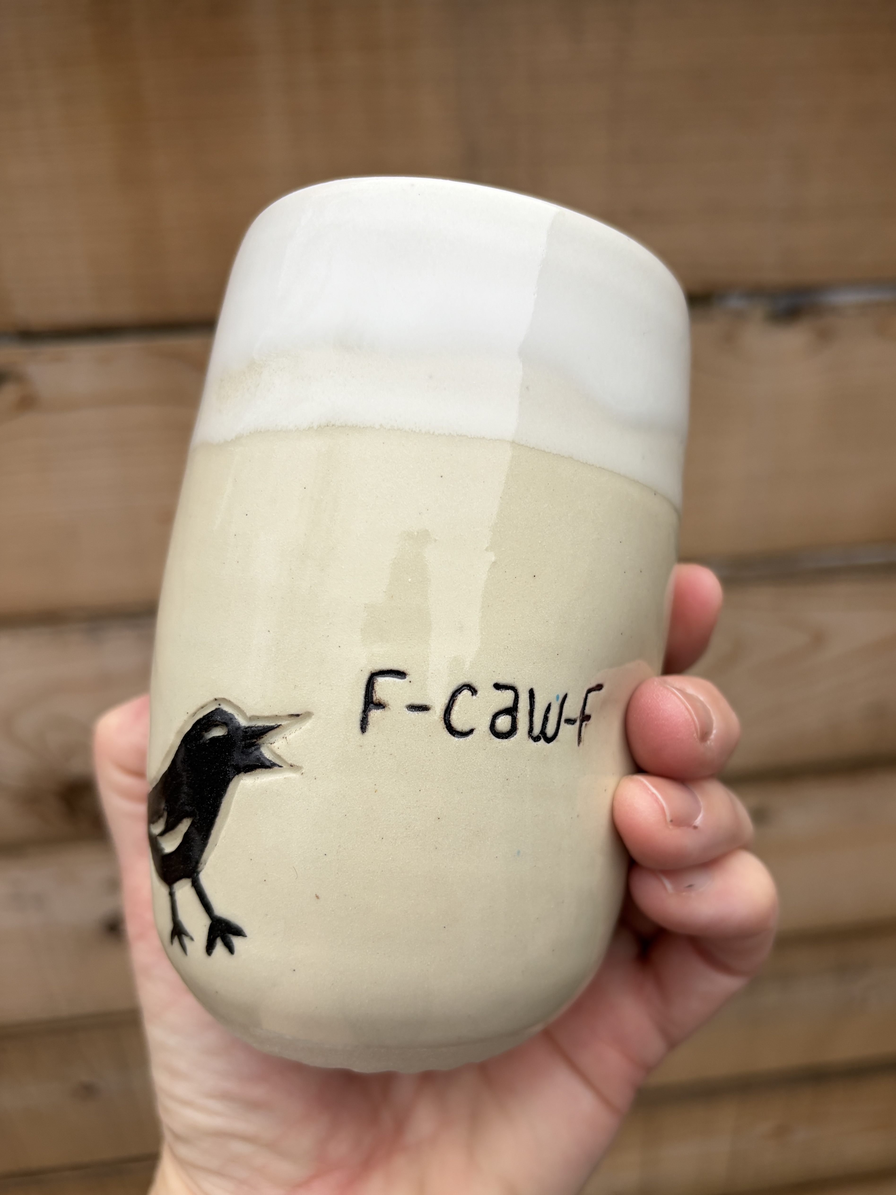 Crow tumbler – white rim, White clay $25