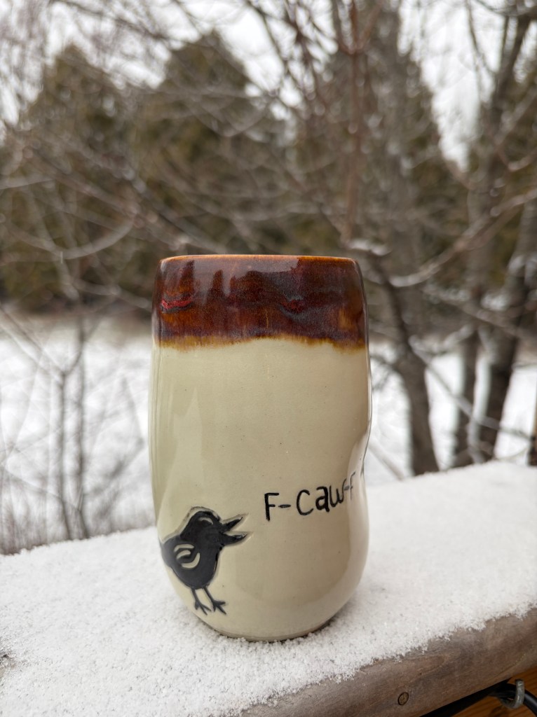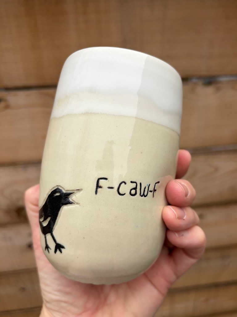 Crow tumbler – brown rim, White clay $25