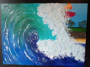 I painted 3o 4”x4” and two 8”x8” canvases for Jeux de l’Acadie 2013. Their theme was ”Comme and surf with us” so I painted some surf boards in the colours of the various regions. To see more click here.
