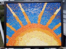 Tanya Roy was the school director for Ecole des Batisseurs since it’s opening in 2008. She is leaving her position as school director in May 2012, so the school personnel planned a special gift for her departure. They asked me in for some ideas and together we came up with the idea of an image painted with all the fingures of the nearly 600 students from the school. In one full day, I went from class to class, to add each child and teachers finger prints on a canvas board. Using various colours, I made a simple image of a sun rising. This was all done by sneaking in from class to class without Mme Tanya seeing me in action! Thanks to all the personnel it was done without being seen and she was very happy with the results once presented to her.